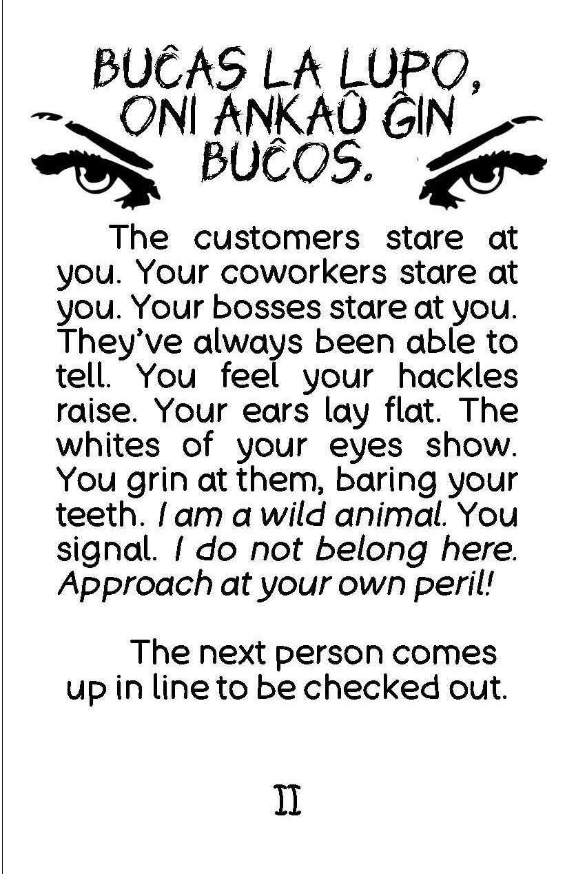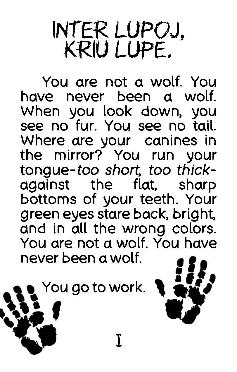 This was made for the Alterhuman Minizine Jam of 2025. Featuring both English writing and Esperanto proverbs, this minizine is a piece of flash fiction about a wolf therianthrope.